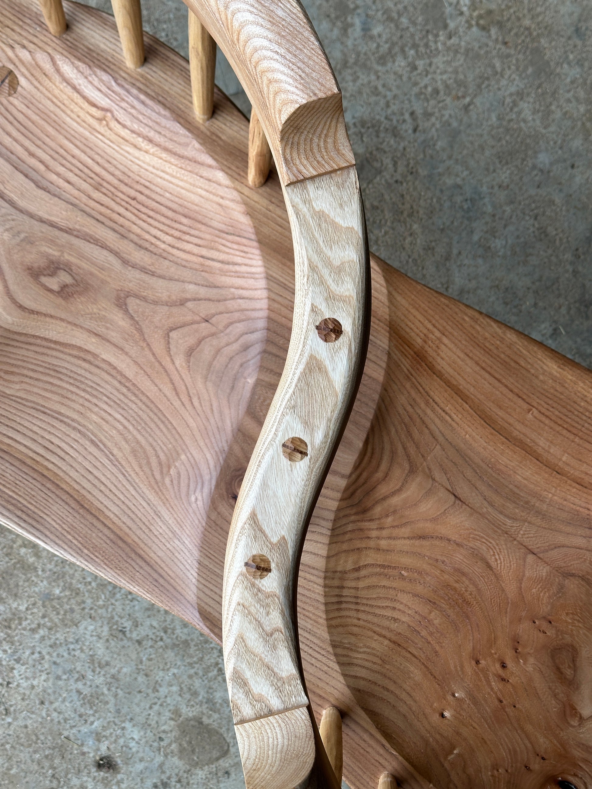 All of the joints are held with traditional wedged mortise and tenon, holding the chair's integral structure together firmly and under tension.